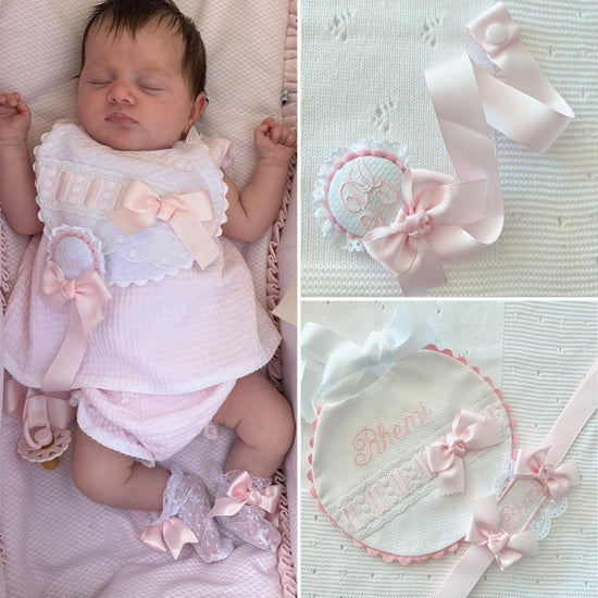 Handmade to order in Spain. Baby bibs, dummy clips and many more items available.