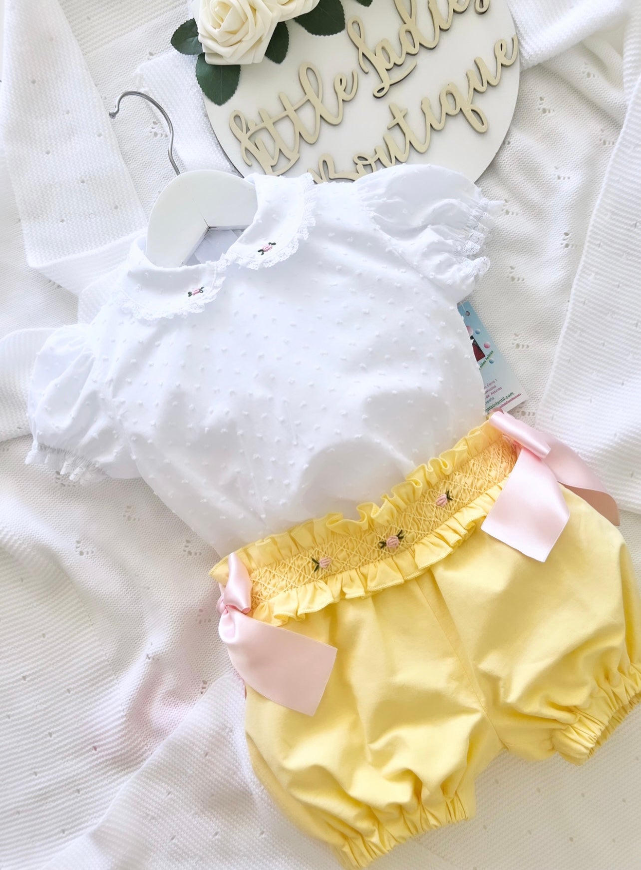 Our exclusive Bellarosa design consists of a Swiss dot blouse with flower details on the collar. Smocked shorts with bows either side.