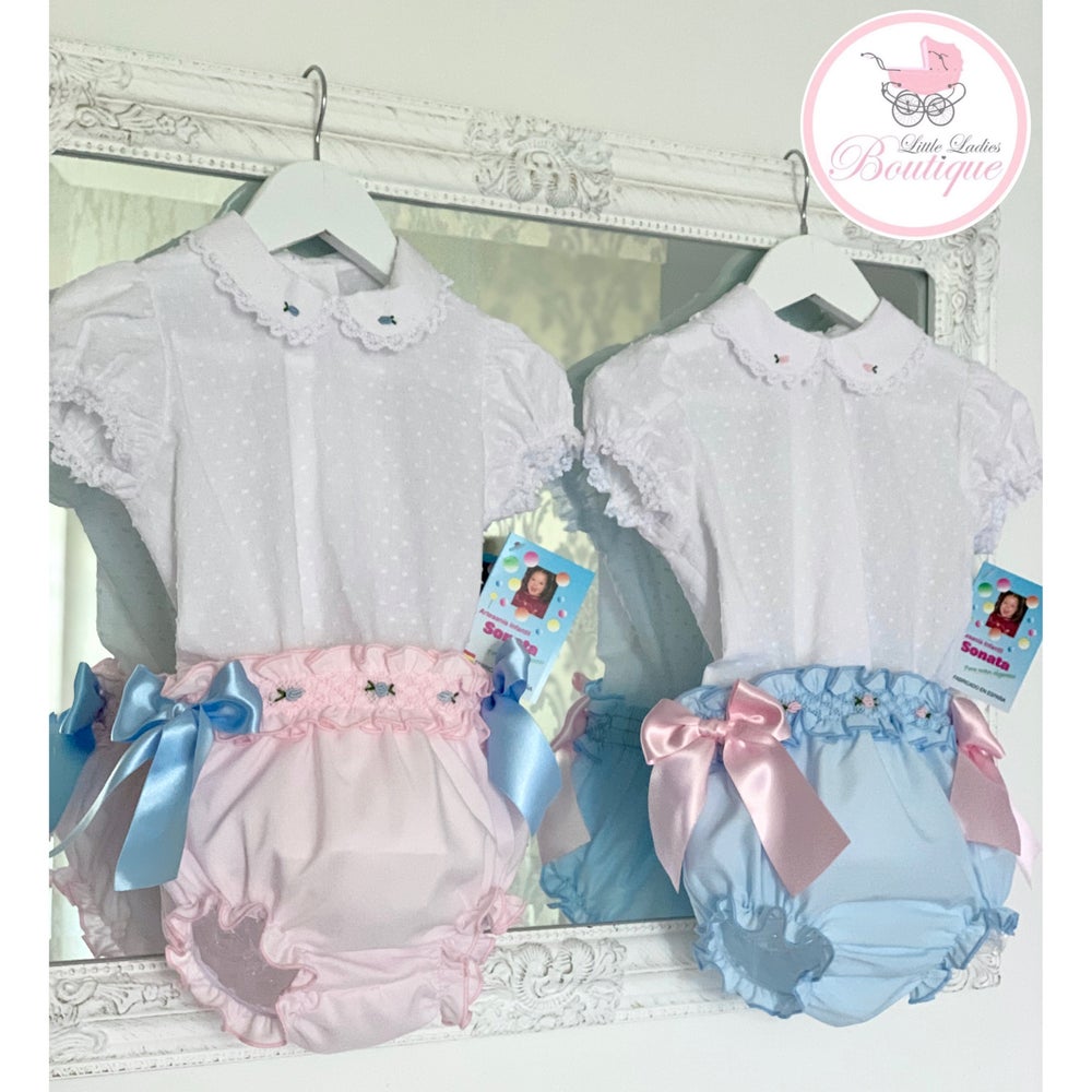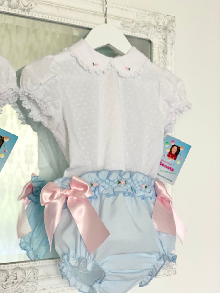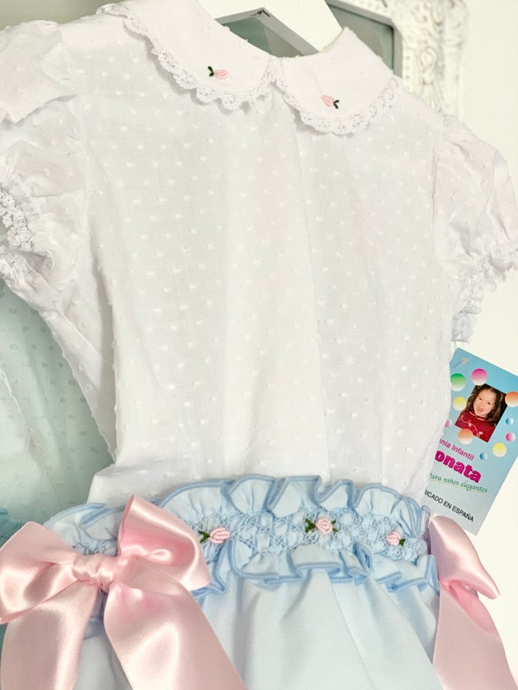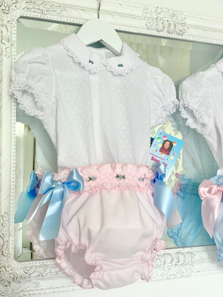 Our exclusive Bellarosa design consists of a Swiss dot blouse with flower details on the collar. Smocked bloomers with bows either side.