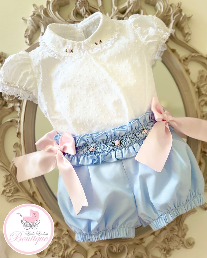 Our exclusive Bellarosa design consists of a Swiss dot blouse with flower details on the collar. Smocked shorts with bows either side.