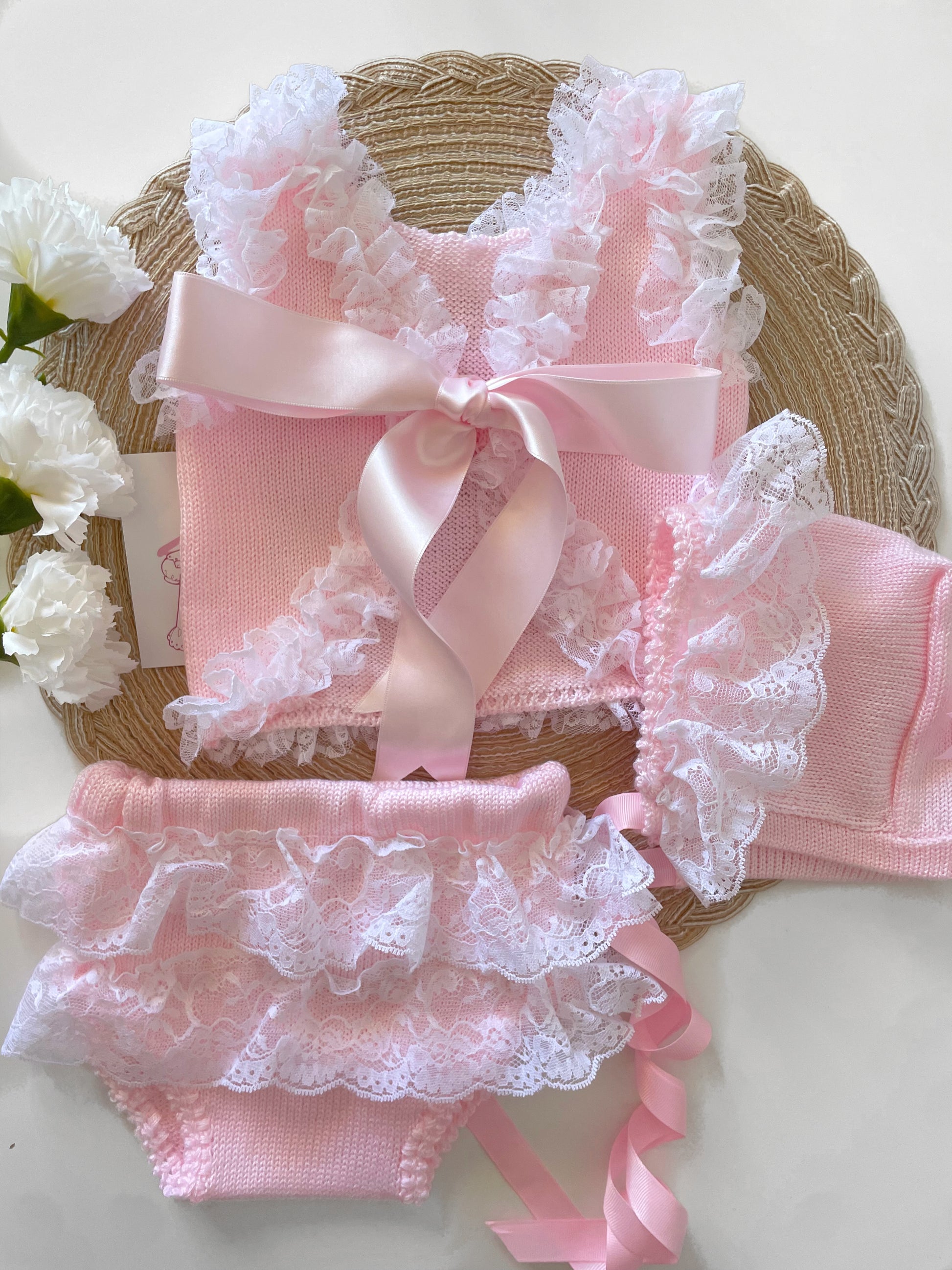 Pink knitted 3 piece set with white lace detailing. Small fit.