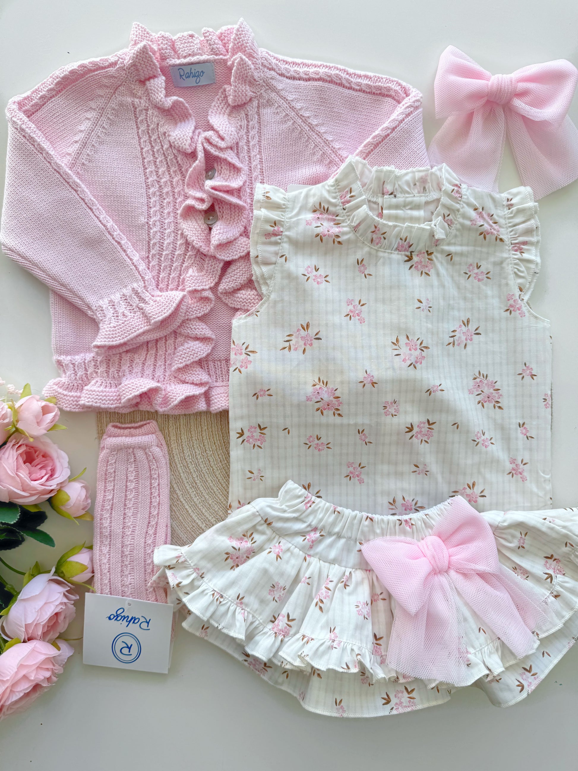 Gorgeous exclusive floral fabric blouse & skorts set with matching summer knit cardigan.