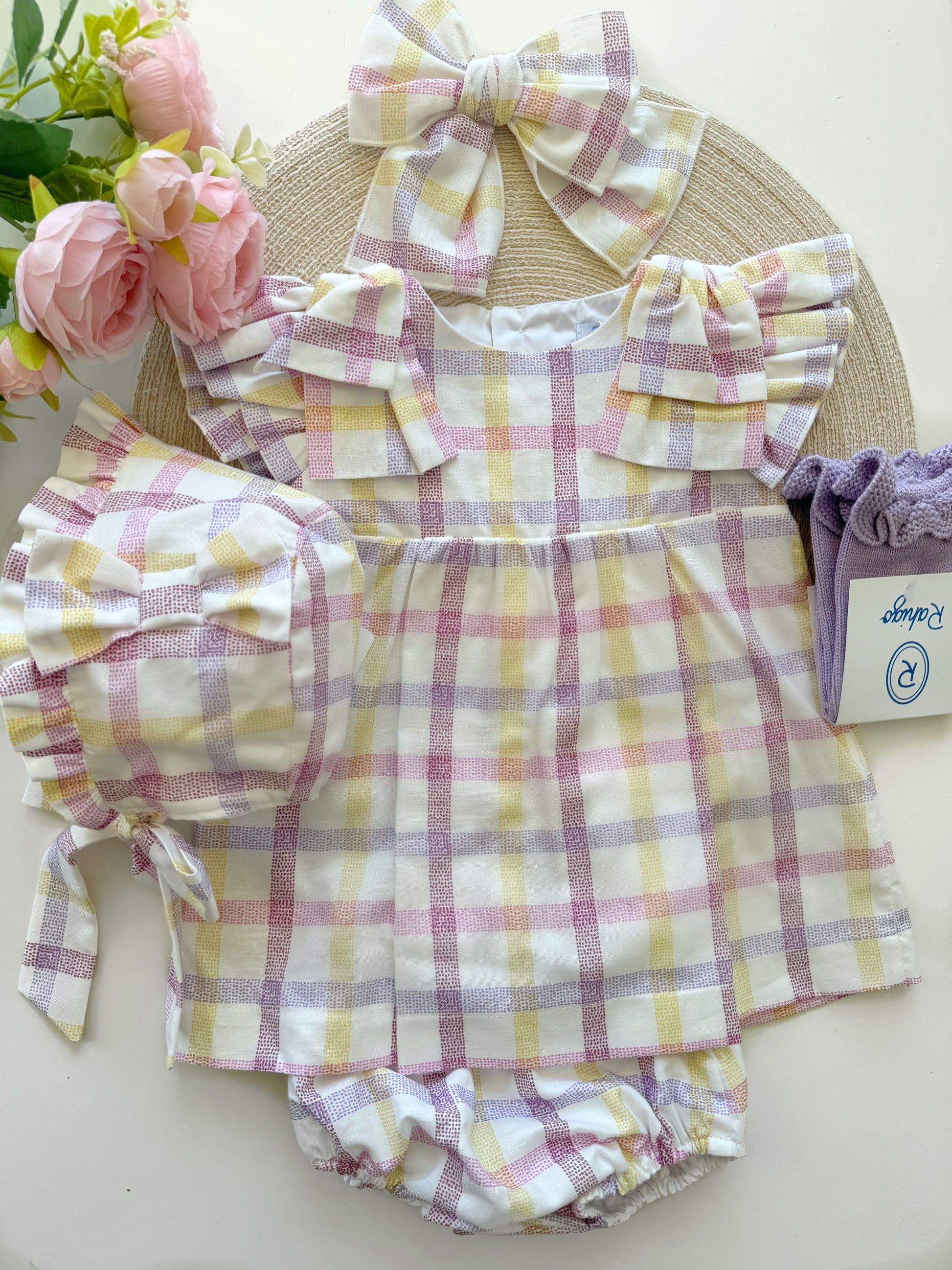 A line dress with flutter sleeves and bows on the shoulder, dress comes with matching knickers.
