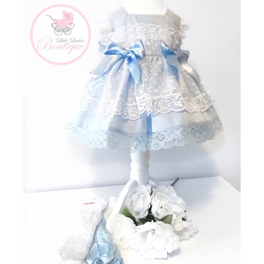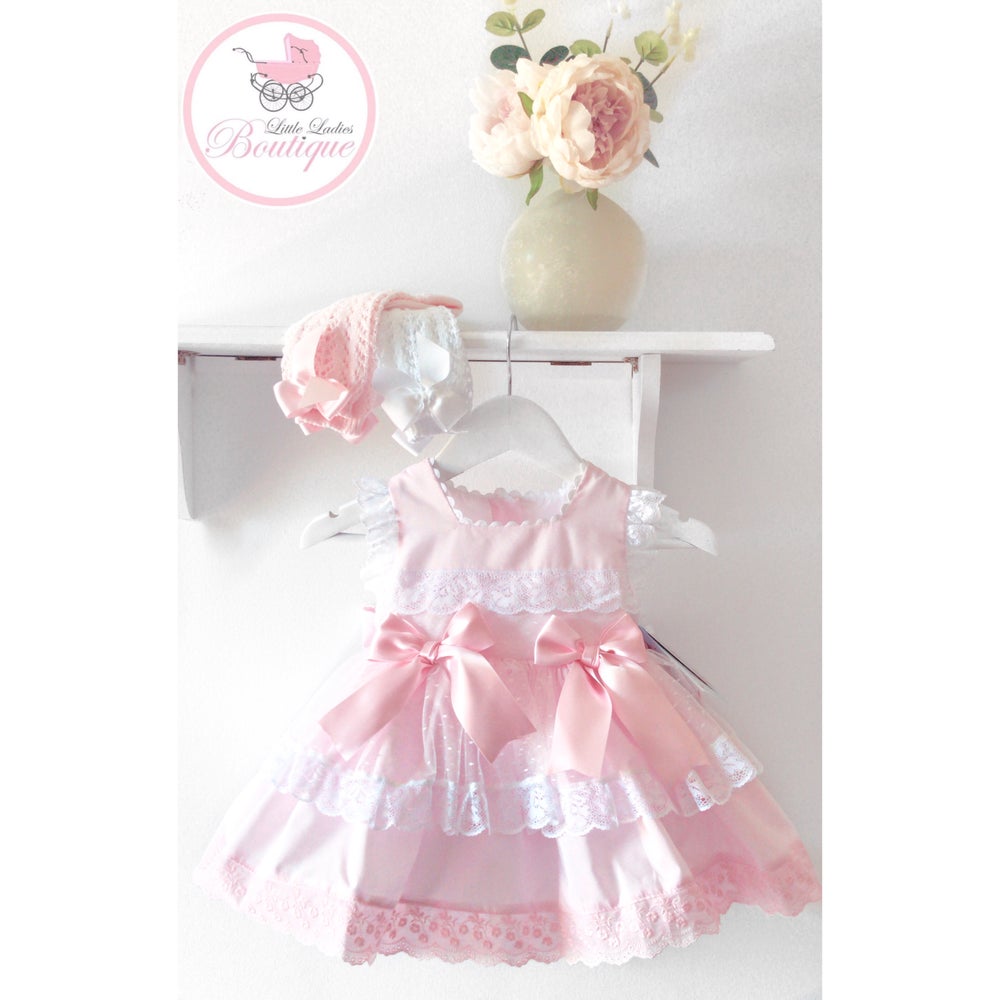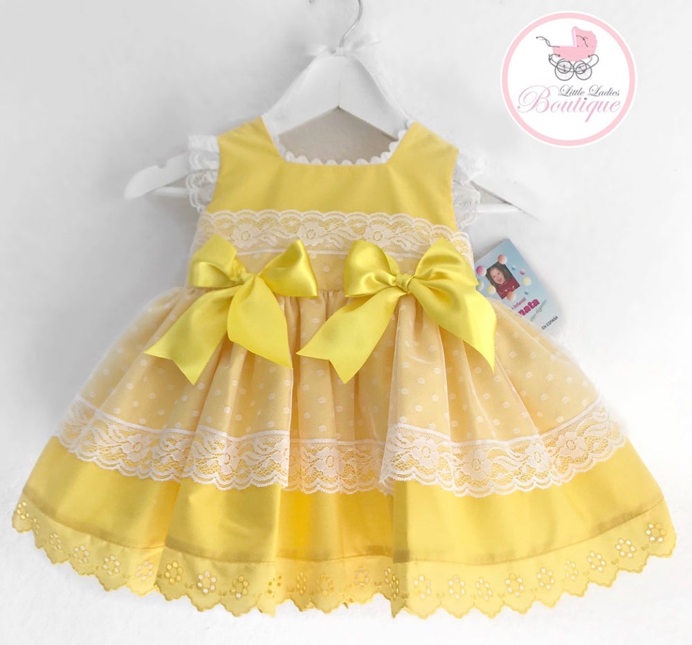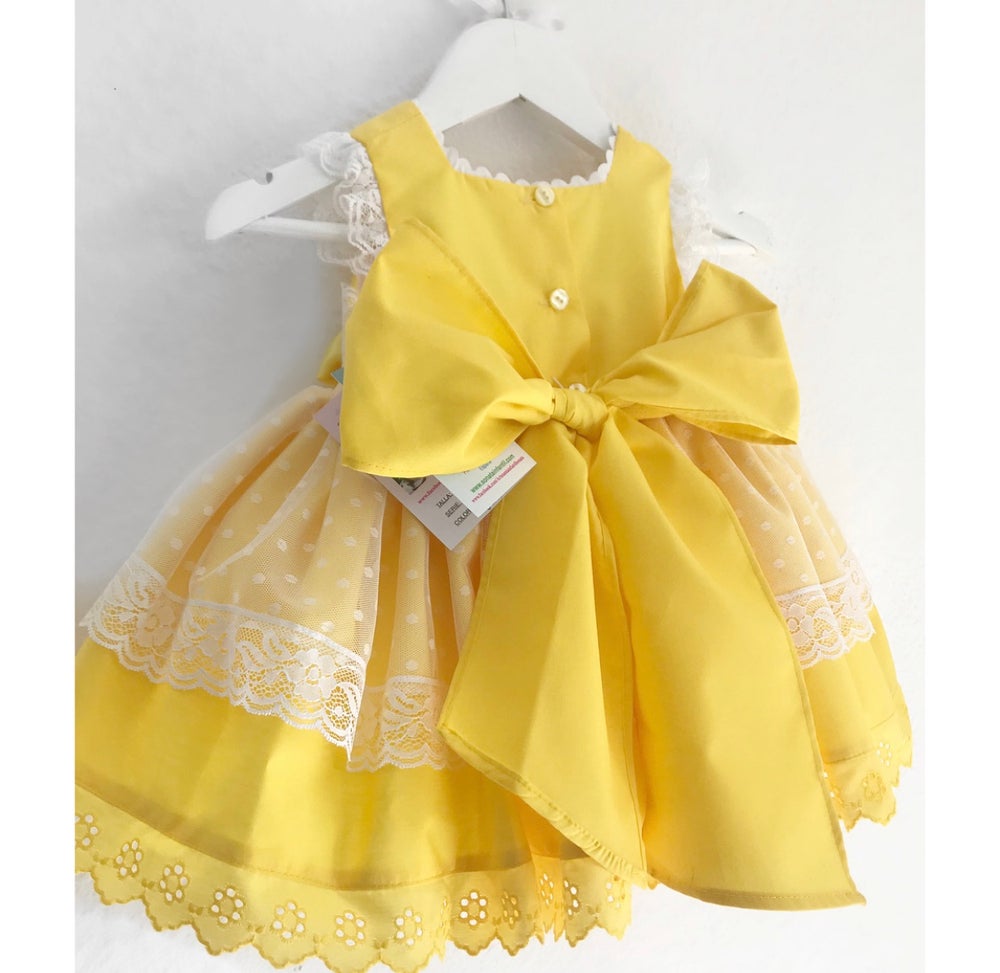 Beautiful handmade dress from the Spanish brand sonata. Made with lightweight material perfect for summer. Delicate lace detailing with two signature bows each side. sleeves can be customised. Change to puff sleeves, sheer 3/4 length or long. Built in petticoat for that extra twirl. Have your dress made in any colour: Baby pink Baby blue Lilac Yellow Cream Red You can also mix up the bow colors to for a pretty color contrast. Turnaround time aprox. 4 weeks.