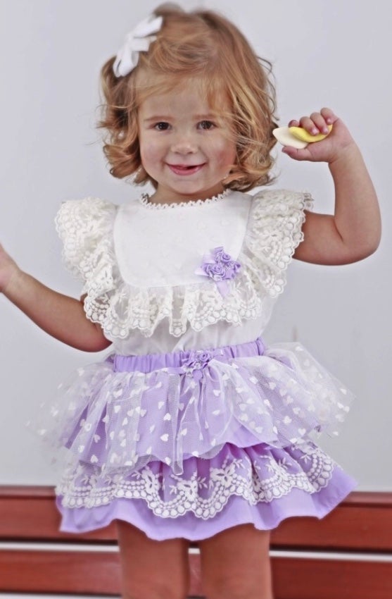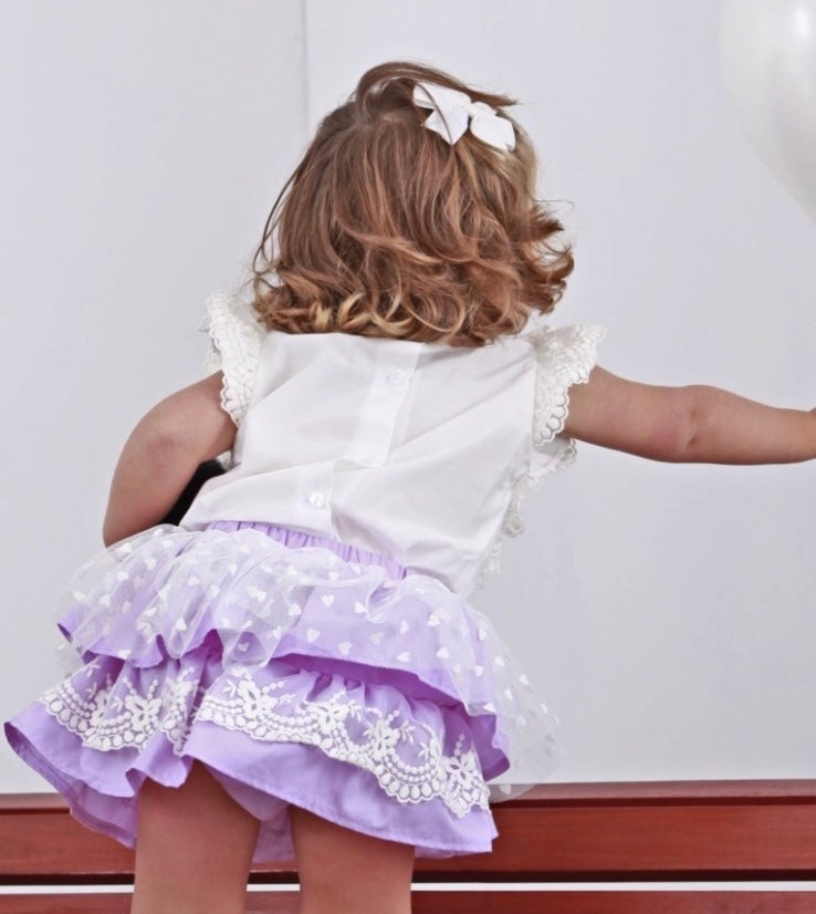 Handmade to order from the brand Sonata. True to size. Sets consists of a frilly blouse with skorts. Can be made in baby pink, lilac, baby blue and lemon. Turnaround time approximately 4 weeks.
