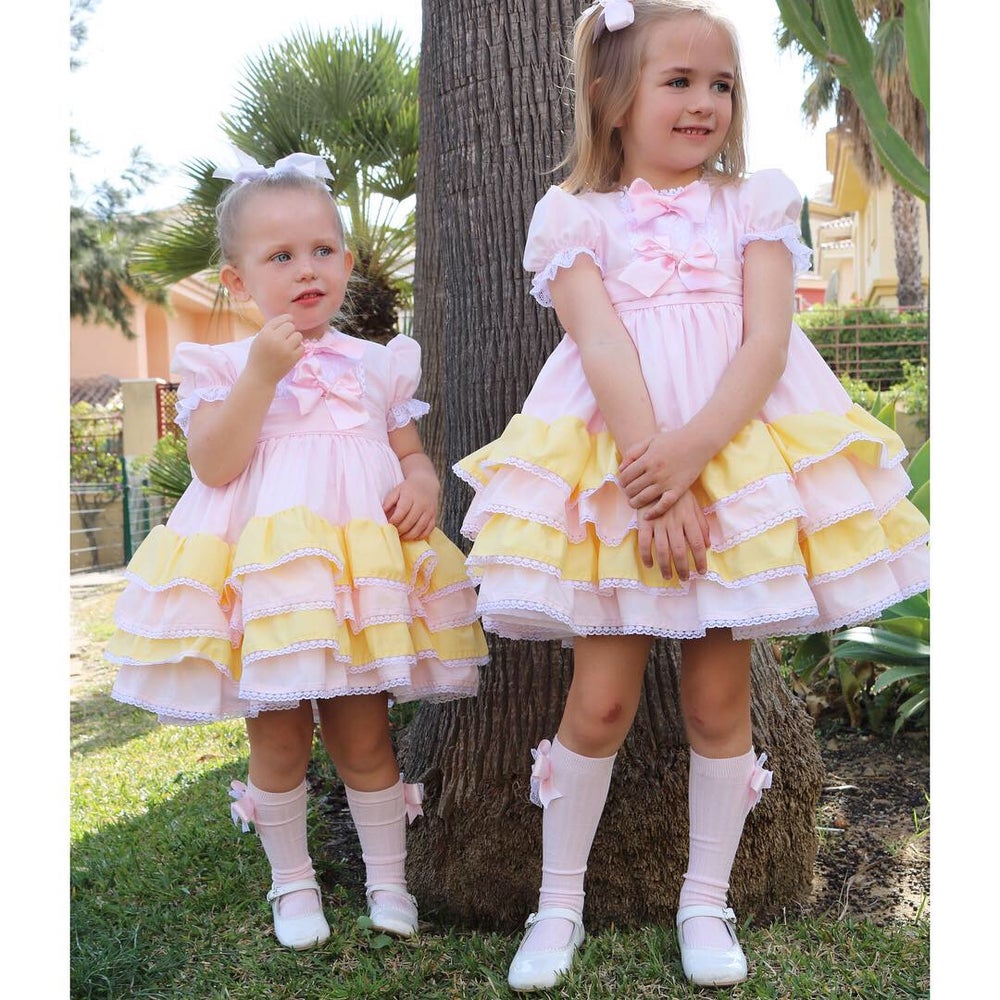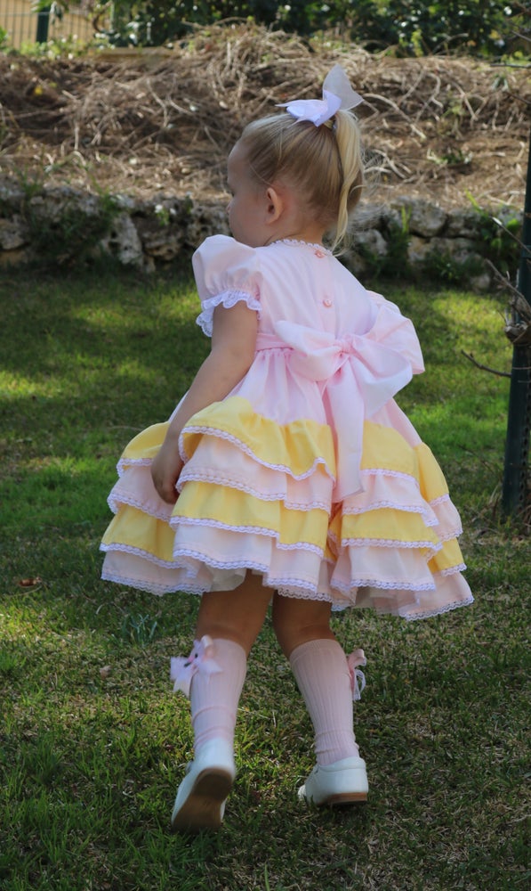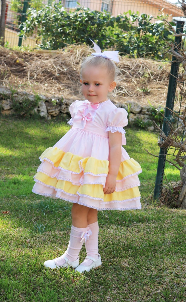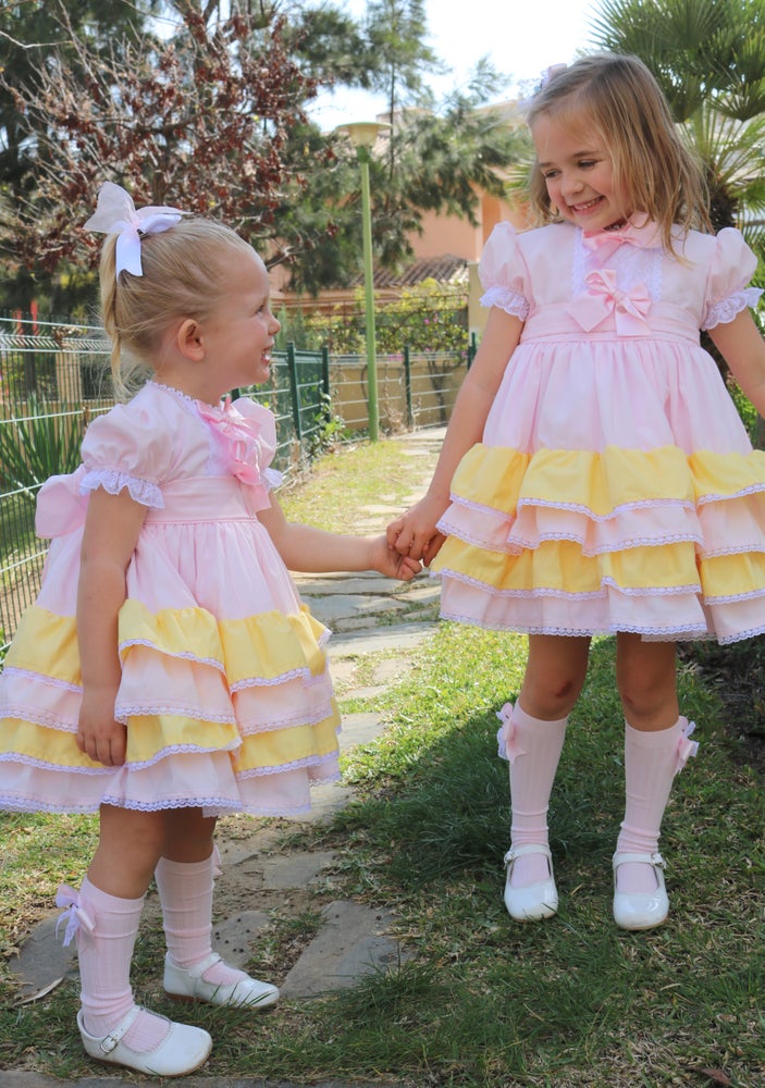 Puff short sleeves with a lace front and horizontal double bows. Baby pink and lemon layers lined with lace.